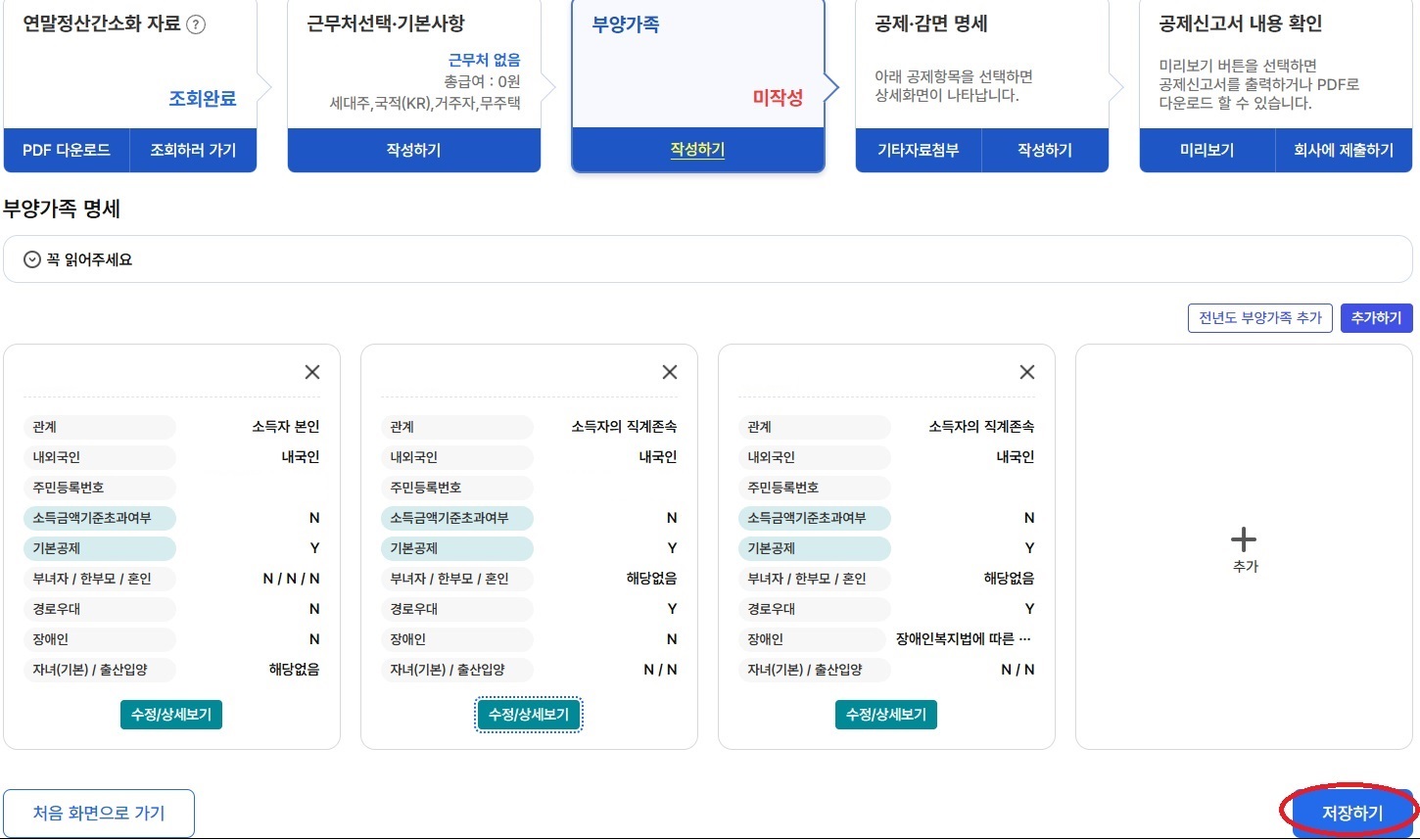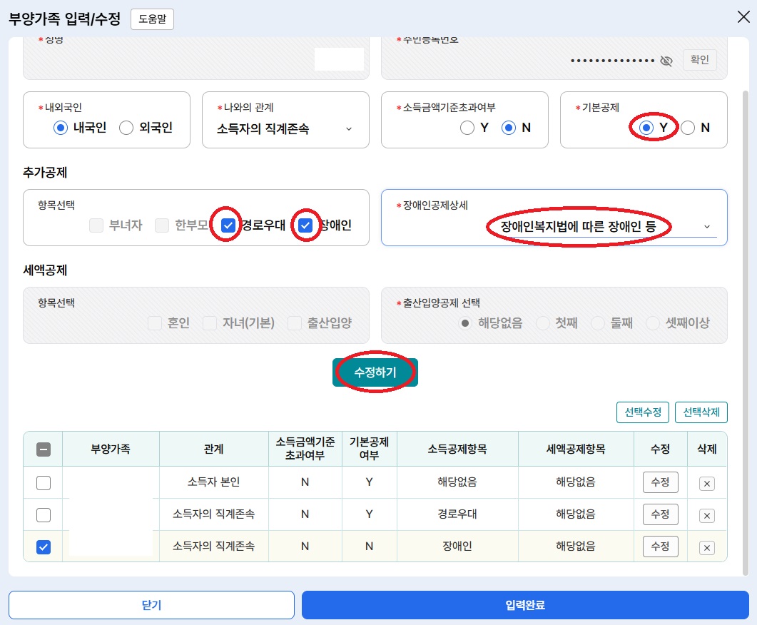 첫 번째 부양가족 수정/상세보기